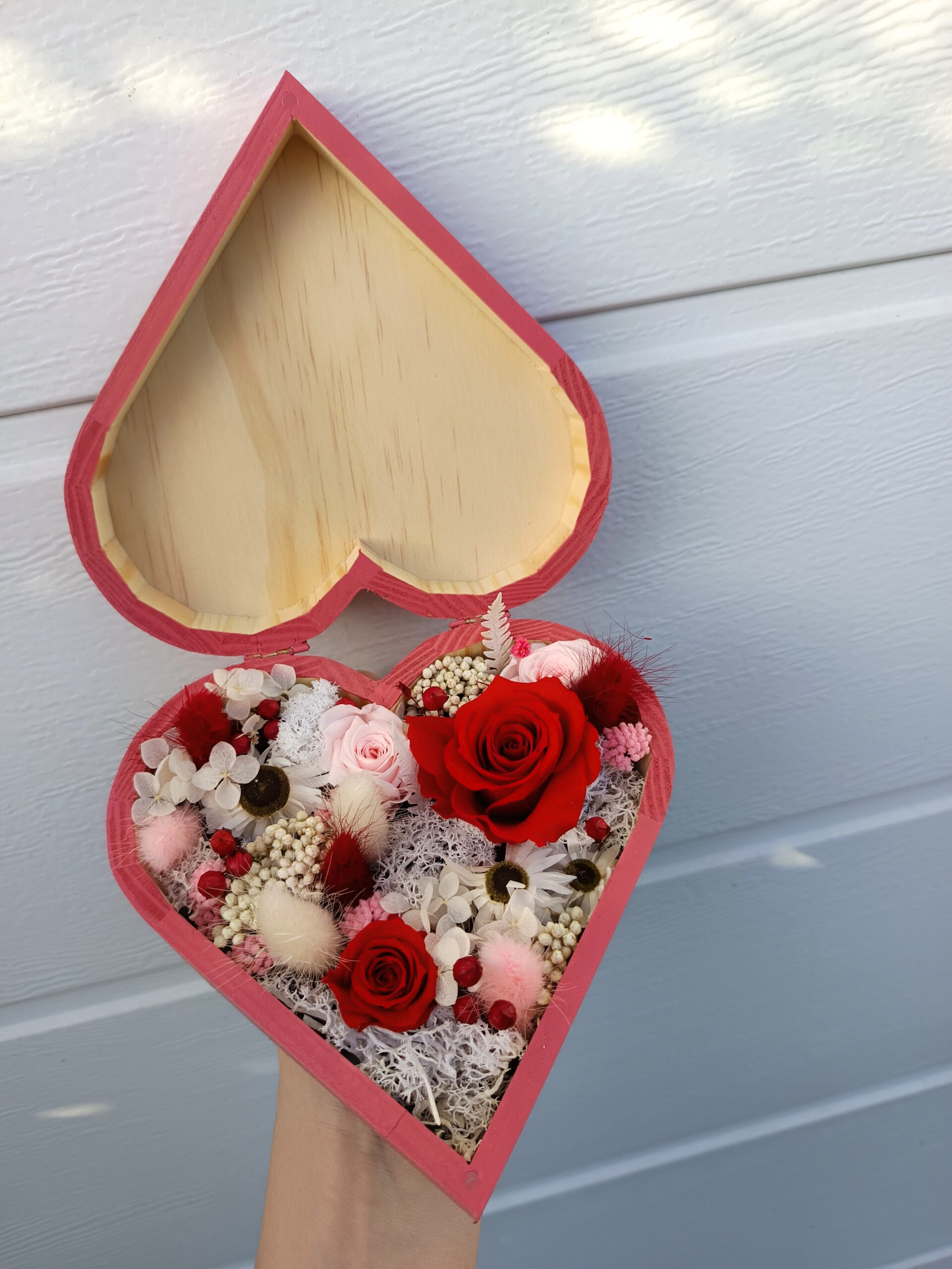Une boite en fleurs séchées en forme de cœur, composé de fleurs séchées et de roses stabilisées rouges et rosées.