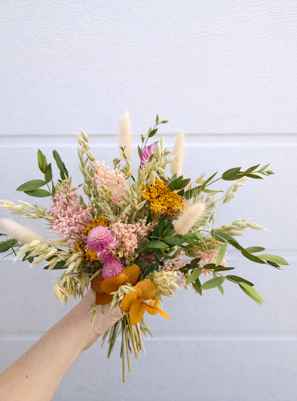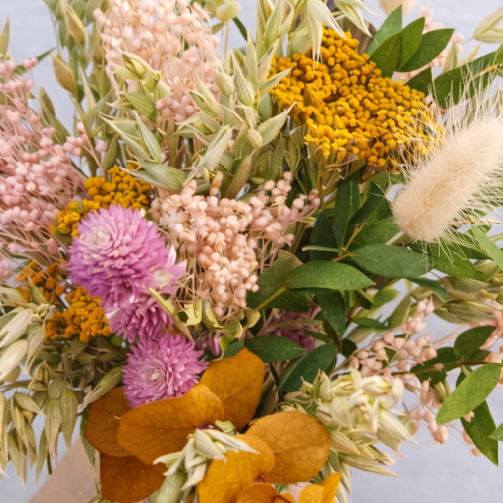 - Fleurs & feuillages : achillée jaune séchée, lagurus, scabieuse, broom bloom, avoine, gomphrena, eucalyptus parvifolia séché naturel