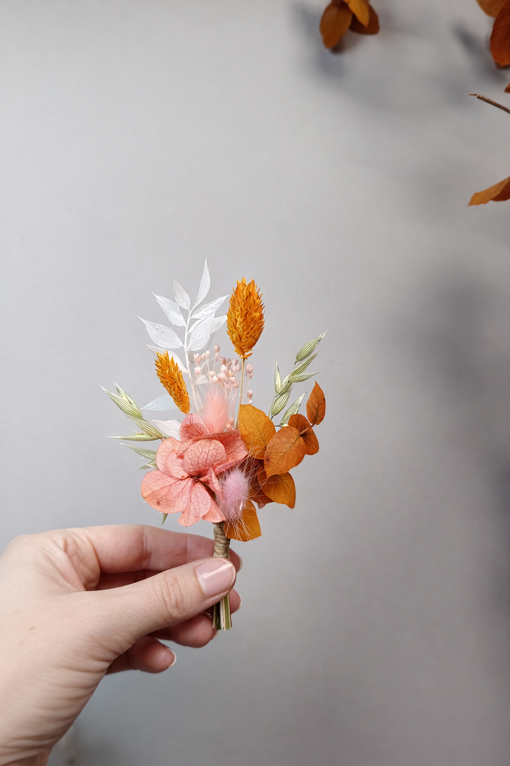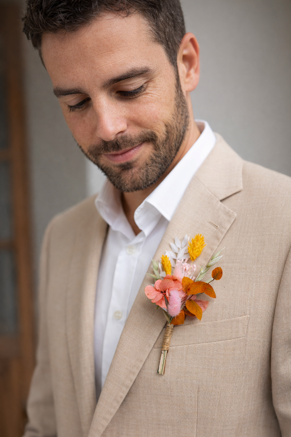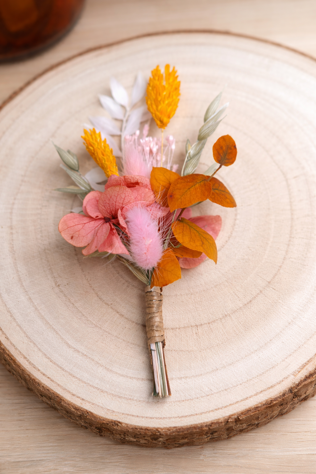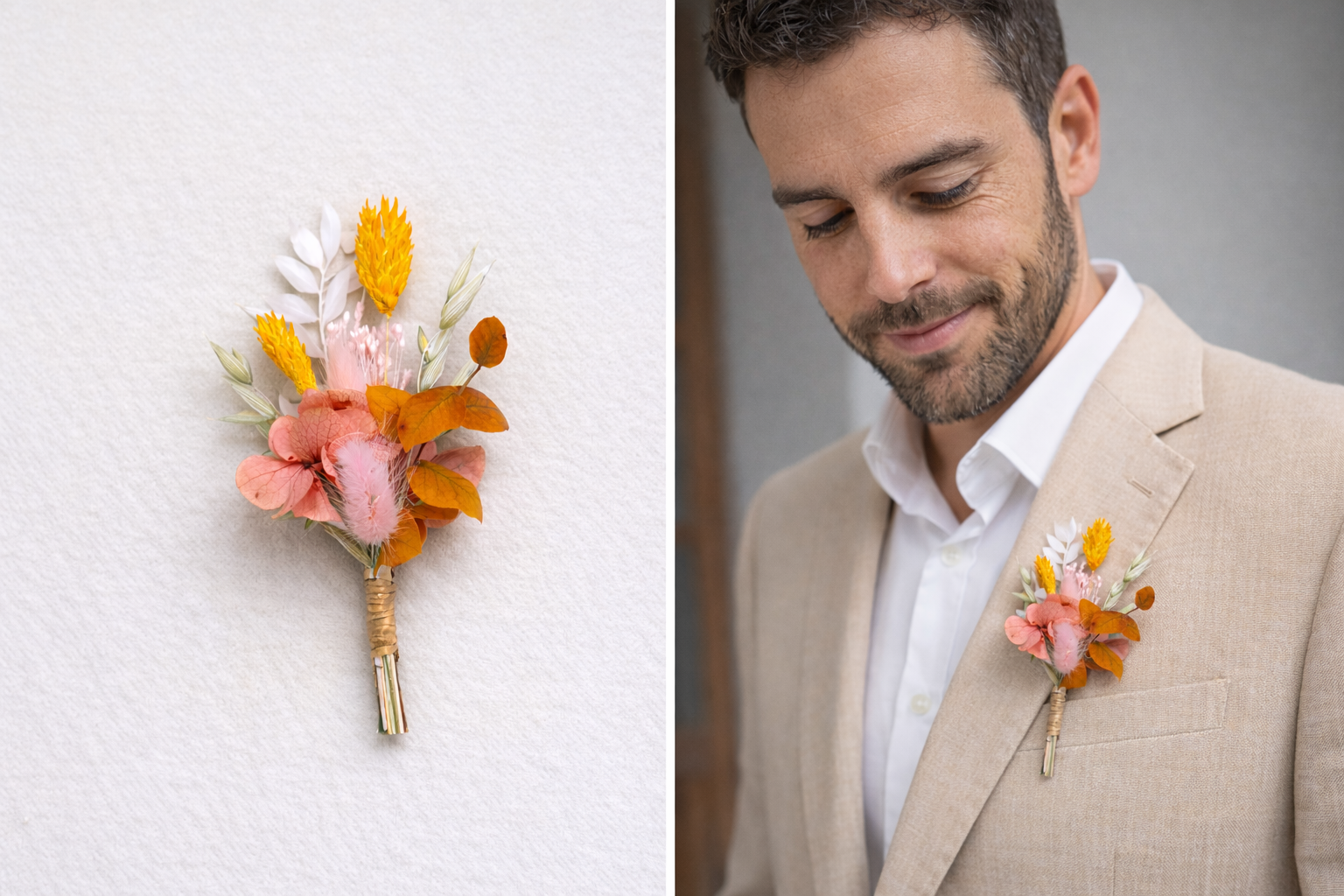 Cette boutonnière en fleurs séchées a été imaginée comme un détail raffiné, capable de faire la différence le jour du mariage. Les nuances orangées apportent chaleur et caractère, équilibrées par la douceur du rose pâle et la luminosité du blanc, pour une composition harmonieuse et intemporelle.