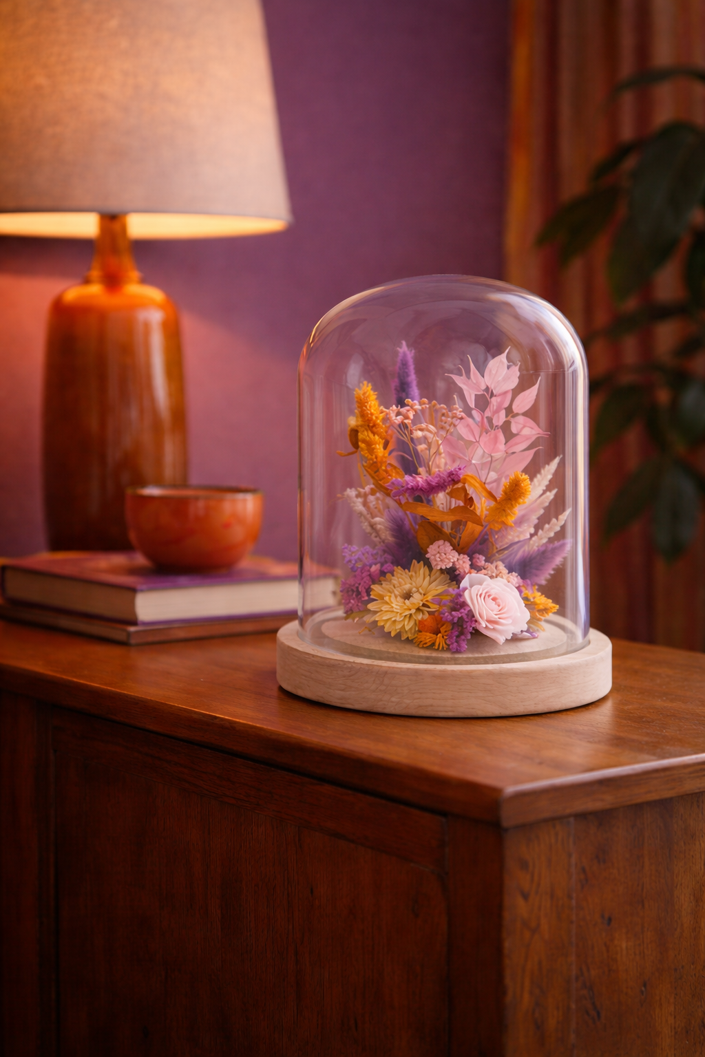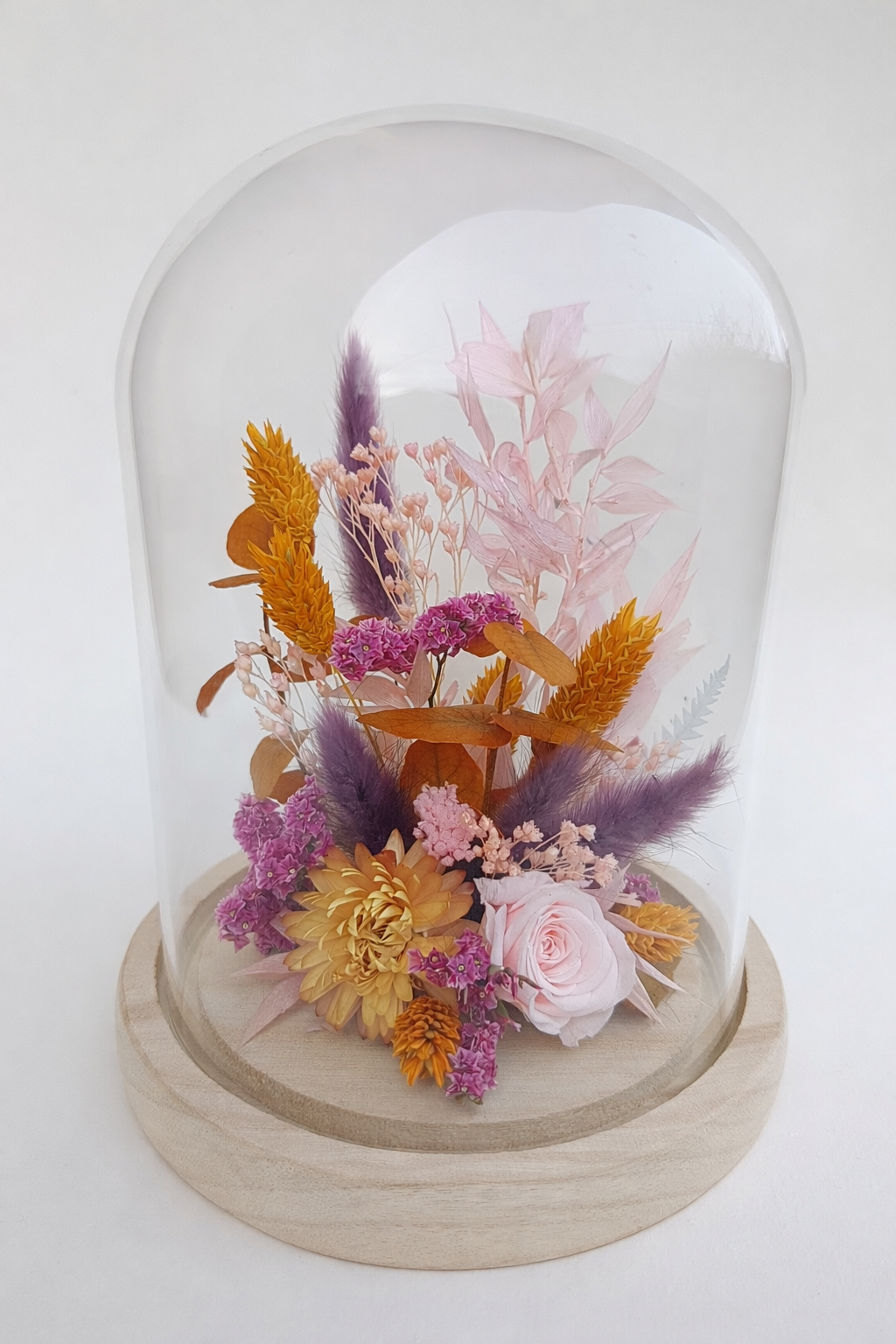 Sous son dôme en verre, les fleurs séchées et stabilisées se répondent dans une harmonie subtile de violet, rose poudré, relevée par quelques accents fuchsia et orangés qui apportent chaleur et caractère.