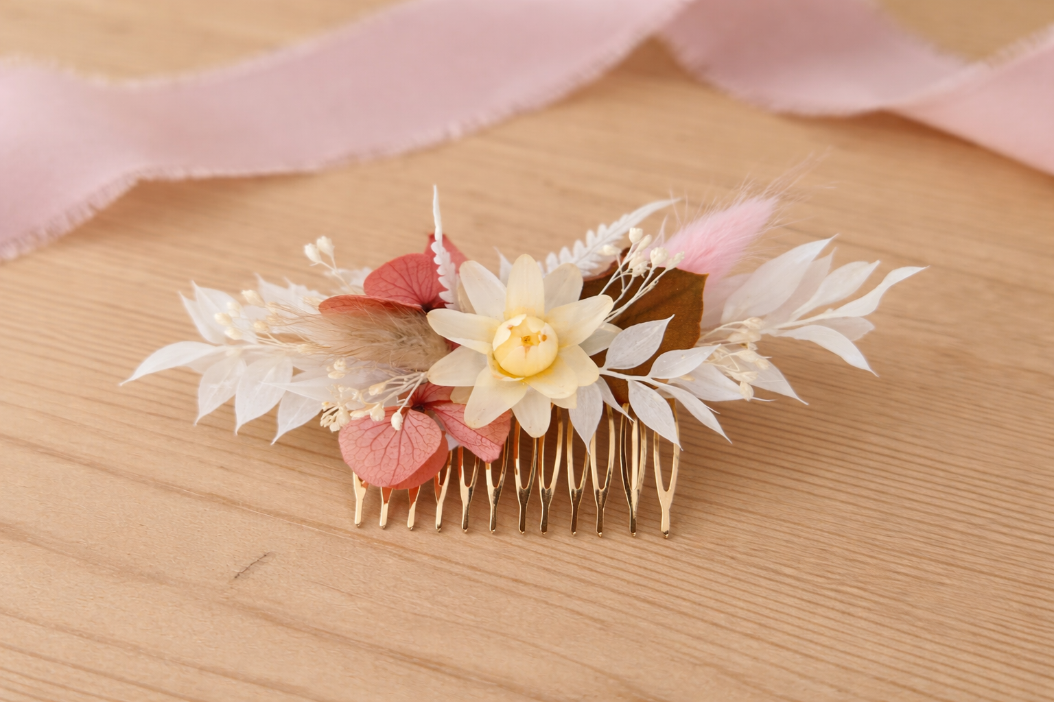 Chaque peigne en fleurs séchées est réalisé avec soin dans mon atelier proche de Bouloc (31620) et peut être personnalisé sur demande. Les teintes, le volume ou la composition florale peuvent être ajustés afin de créer un accessoire en parfaite harmonie avec ta tenue et ton univers.